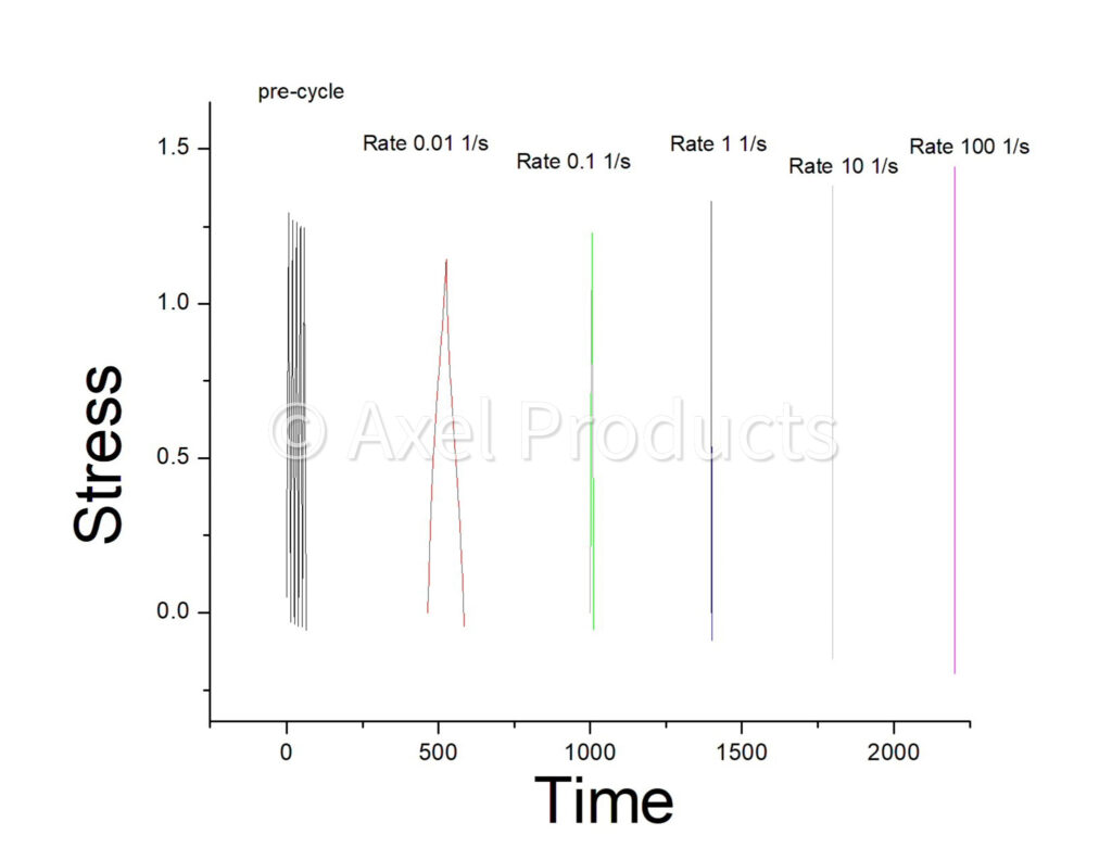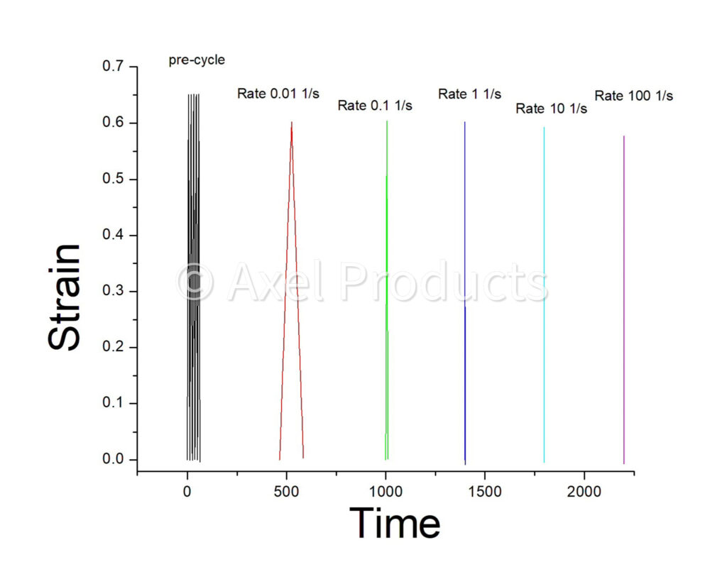 In this case, the objective is to characterize the strain rate sensitivity and hysteresis of a rubber subjected to large strains in service.