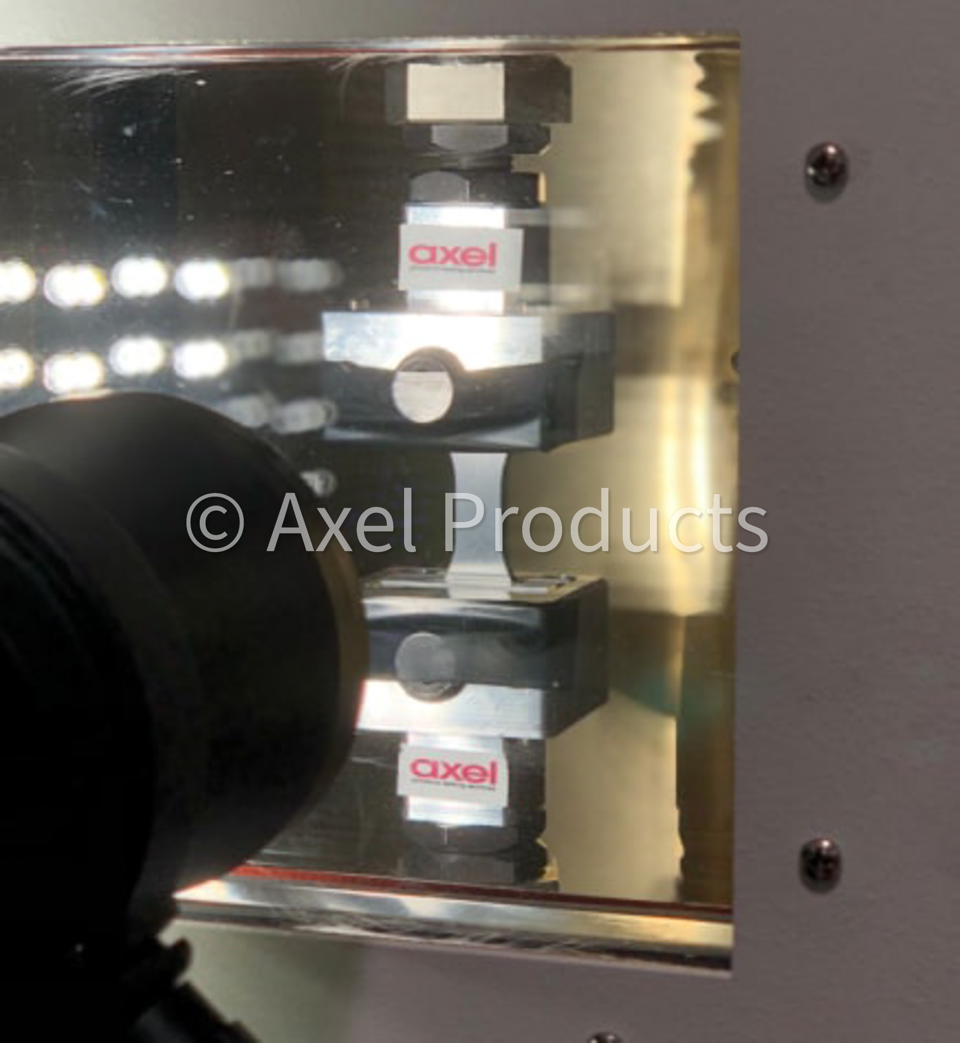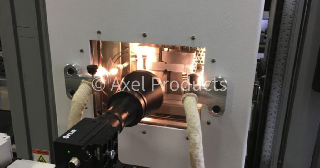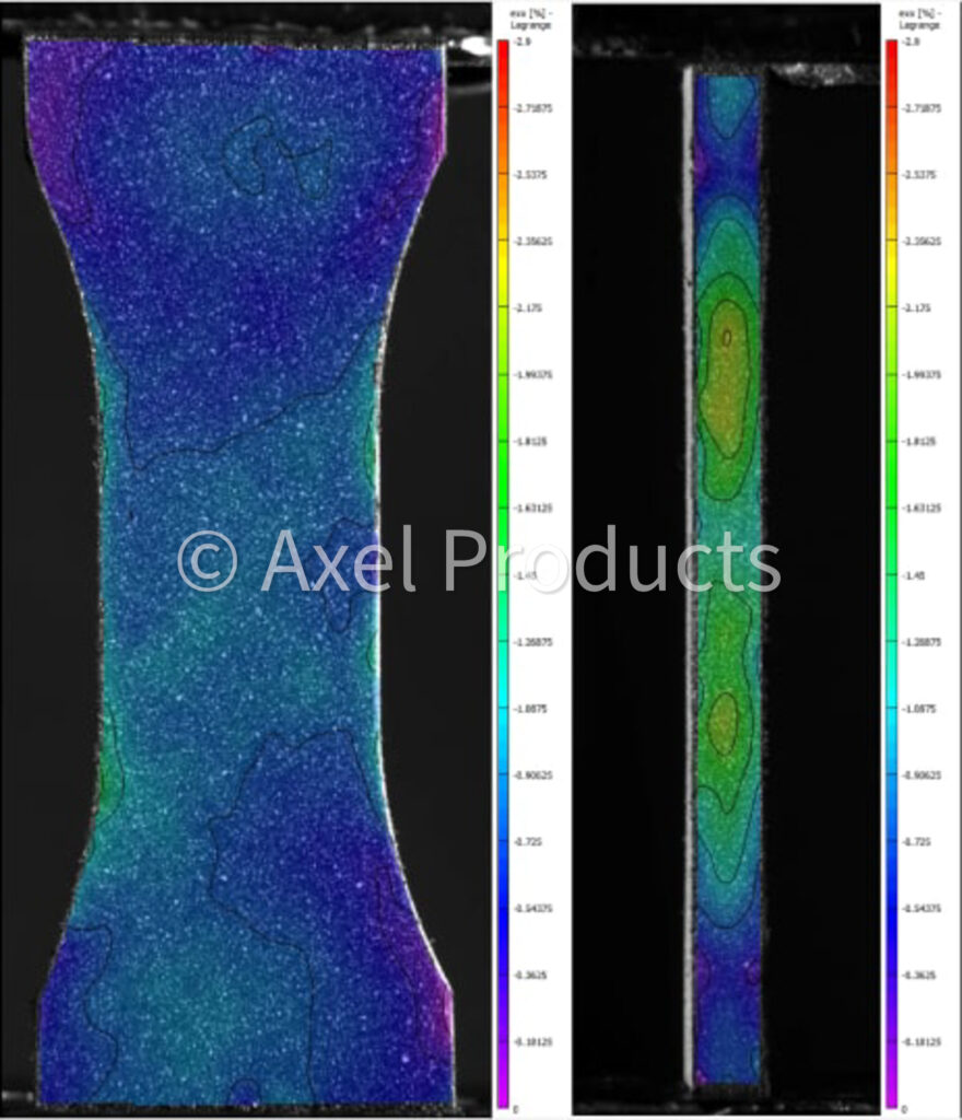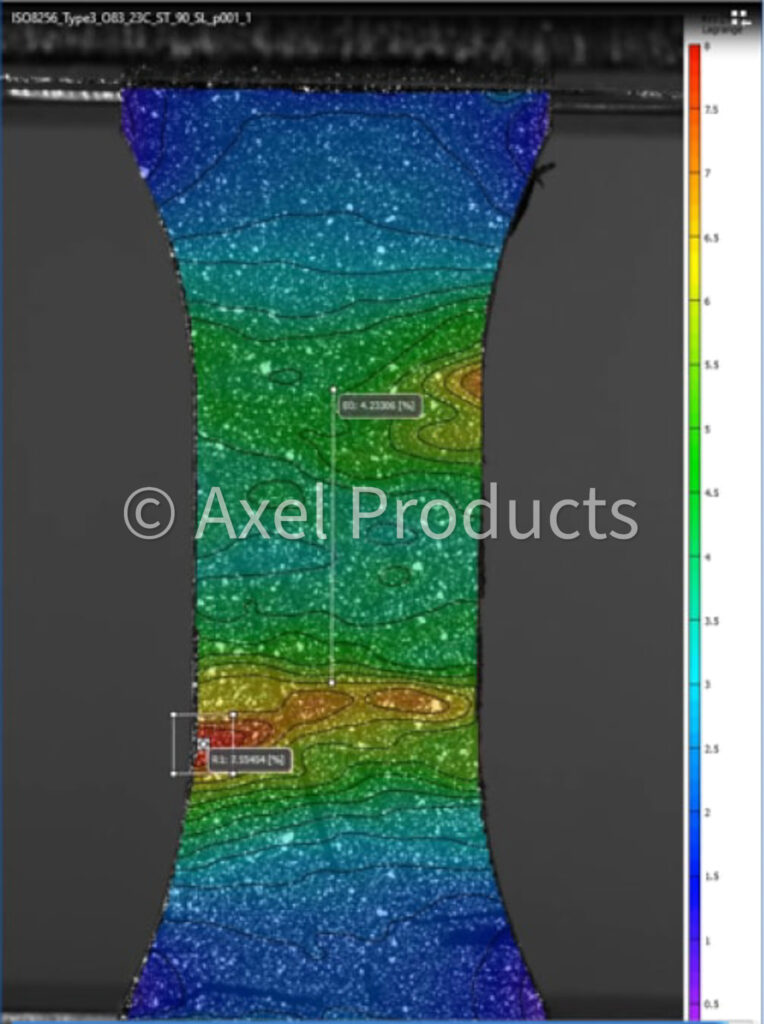 Typically, the first critical strain measurement occurs at very low strains where the initial material stiffness (modulus of elasticity) will be determined. High resolution optical extensometers using dot tracking or digital image correlation (DIC) techniques are used to measure strains at Axel.