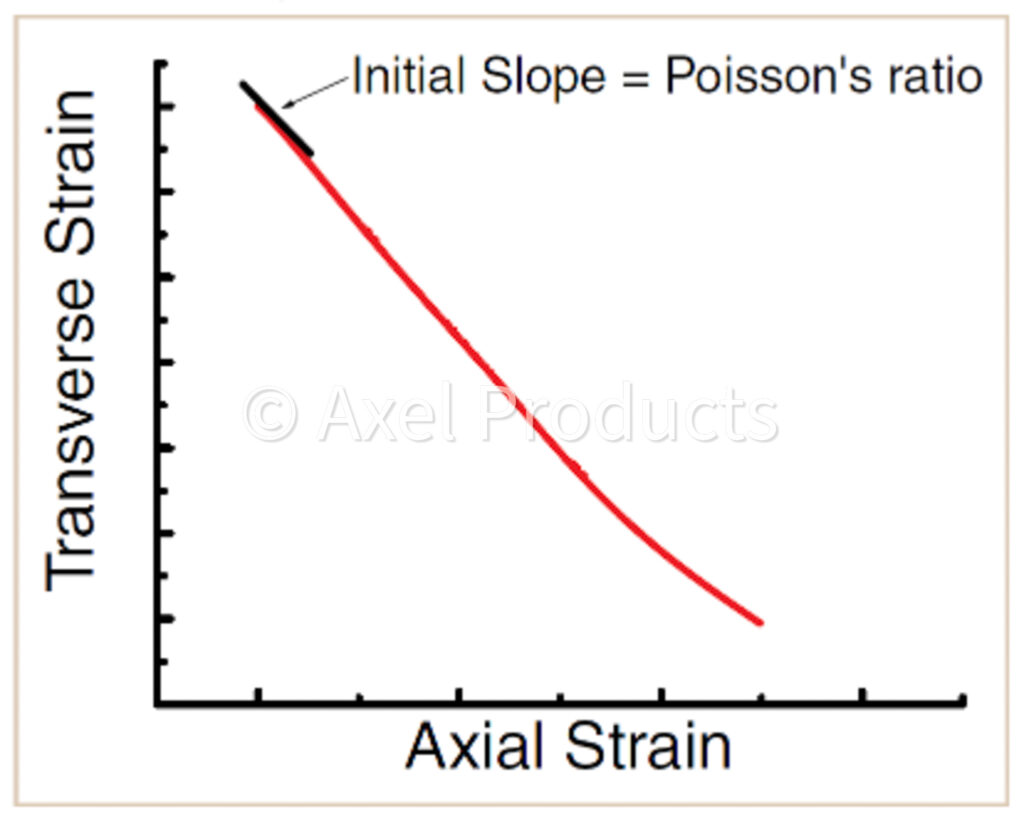 Transverse strain is sometimes measured in the modulus region in combination with axial strain such that the ratio of transverse strain to axial strain may be determined. This slope is the Poisson’s ratio and is a measure of material compressibility. This is one simple measurement that may come out of full field DIC strain measuring.