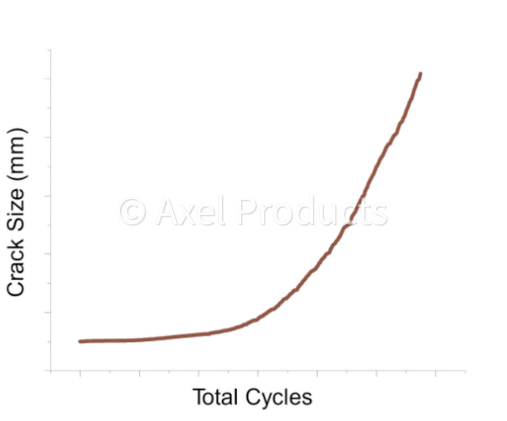 At some point, the crack begins to grow. Since the maximum strain is slowly increasing, the rate at which the crack grows will also increase. The slope of the crack length plotted against cycles is the crack growth rate.