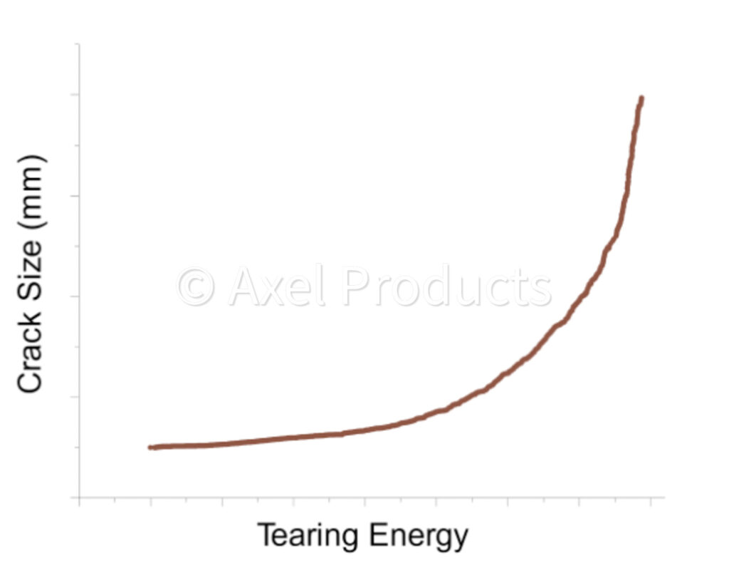 Since the dominant mechanism of mechanical failure in elastomers is the growth of cracks, it makes sense to subject a material to the worst-case direction of crack growing and simply pull open an existing cut. This is the tear strength, or tearing energy test. Unlike some of the ISO and ASTM tests that are similar, this experiment is best performed by adding a very sharp cut into a material and pulling in a Mode I direction. The stress, strain, and energy at which the crack grows provide very useful design limits for engineering design and analysis. From this experiment, a critical tearing energy, Tc, may be calculated.