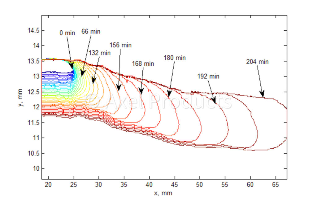 A cut is placed in the specimen far from the edge to avoid edge effects. The specimen is stretched in a loading-unloading pattern such that the minimum strain is zero and the maximum strain slowly increases over 20 hours. Throughout the entire duration of the experiment, the width of the crack is measured.