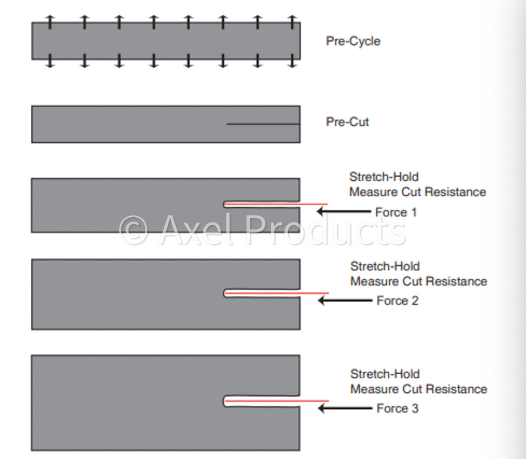 Cutting resistance is measured by applying a sharp blade against pre-strained elastomer specimens while observing the force required to cut.