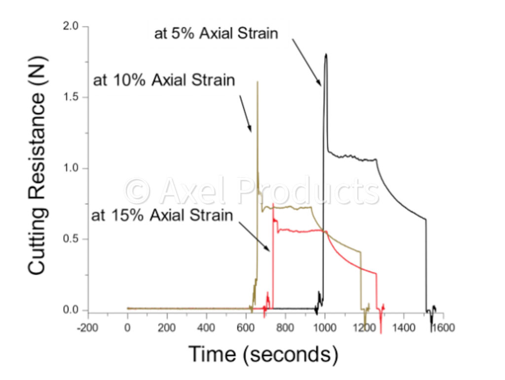 The cutting resistance forces can be used directly to evaluate materials. The resulting data may also be used as part of an intrinsic energy calculation. The experiment is a modern version of the experiment performed by G. J. Lake and O. H. Yeoh referenced in the International Journal of Fracture 14, 509 (1978). The experiment was rediscovered by Will Mars of Endurica in recent years.