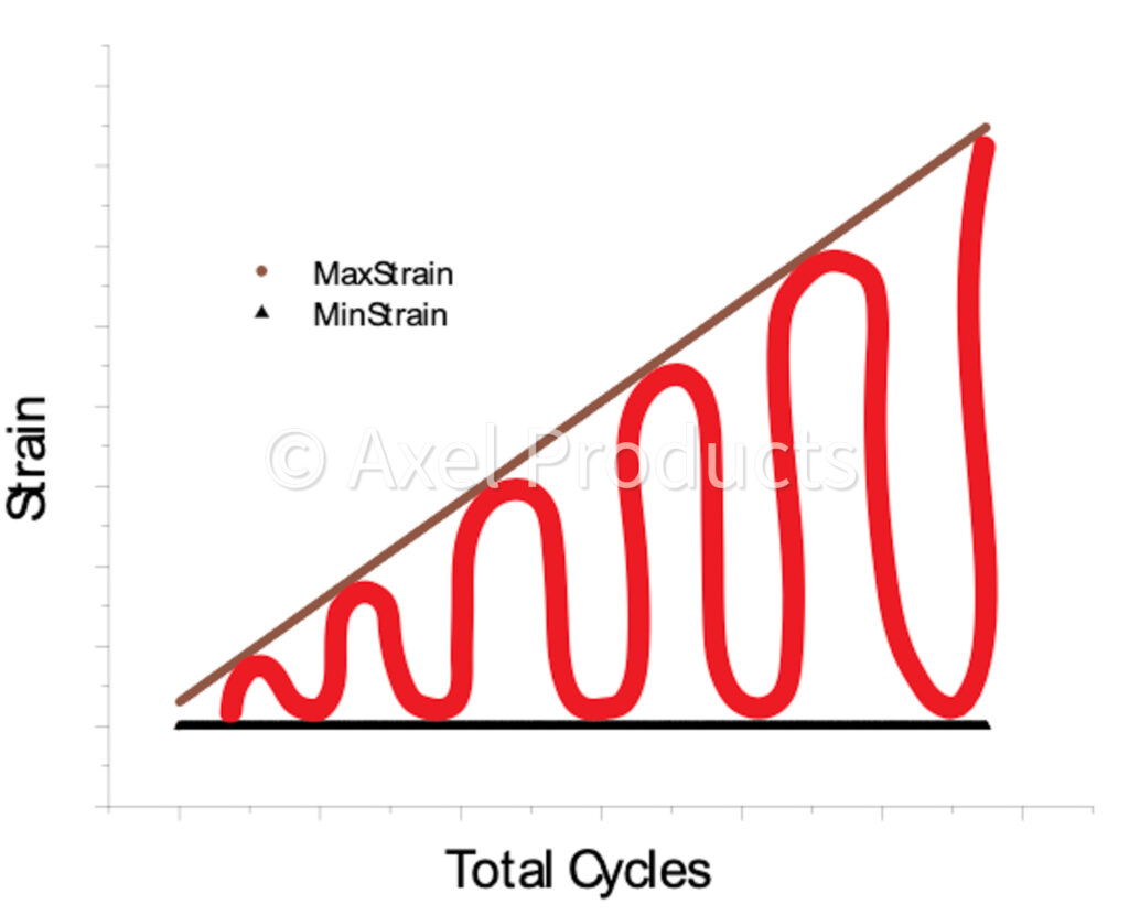 - Some elastomers exhibit an effect called “strain crystallizing.” This effect makes the material very minimum-strain sensitive. An elastomer that fully unloads to zero strain during cycling will fail much faster than when the minimum strain is not unloaded to zero strain. This effect, which can be very significant in some materials, is typically not captured with “S-N” data sets.